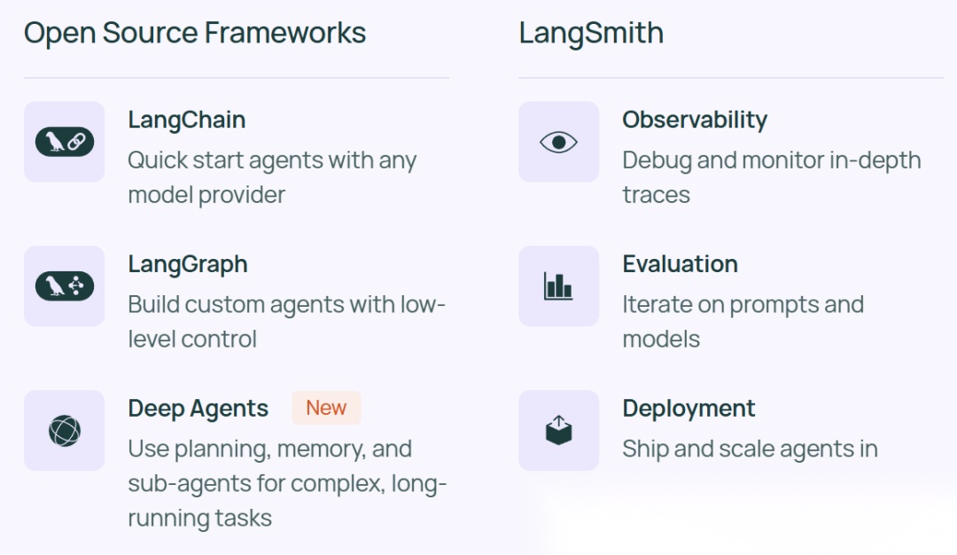 - LangSmith 是一个帮助 AI 团队使用实时生产数据进行持续测试和改进的平台。提供观测、评估与部署功能。