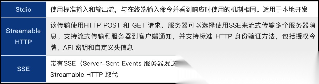 "transport": "streamable_http", # 流式 HTTP:服务器作为独立进程运行,处理 HTTP 请求。支持远程连接和多客户端。