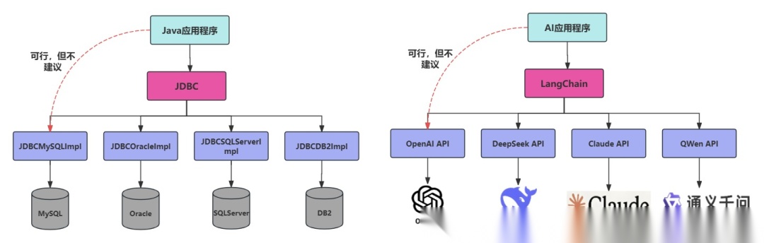 - 学习成本更低:不同模型的API不同,调用方式也有区别,切换模型时学习成本高。使用LangChain,可以以统一、规范的方式进行调用,有更好的移植性。