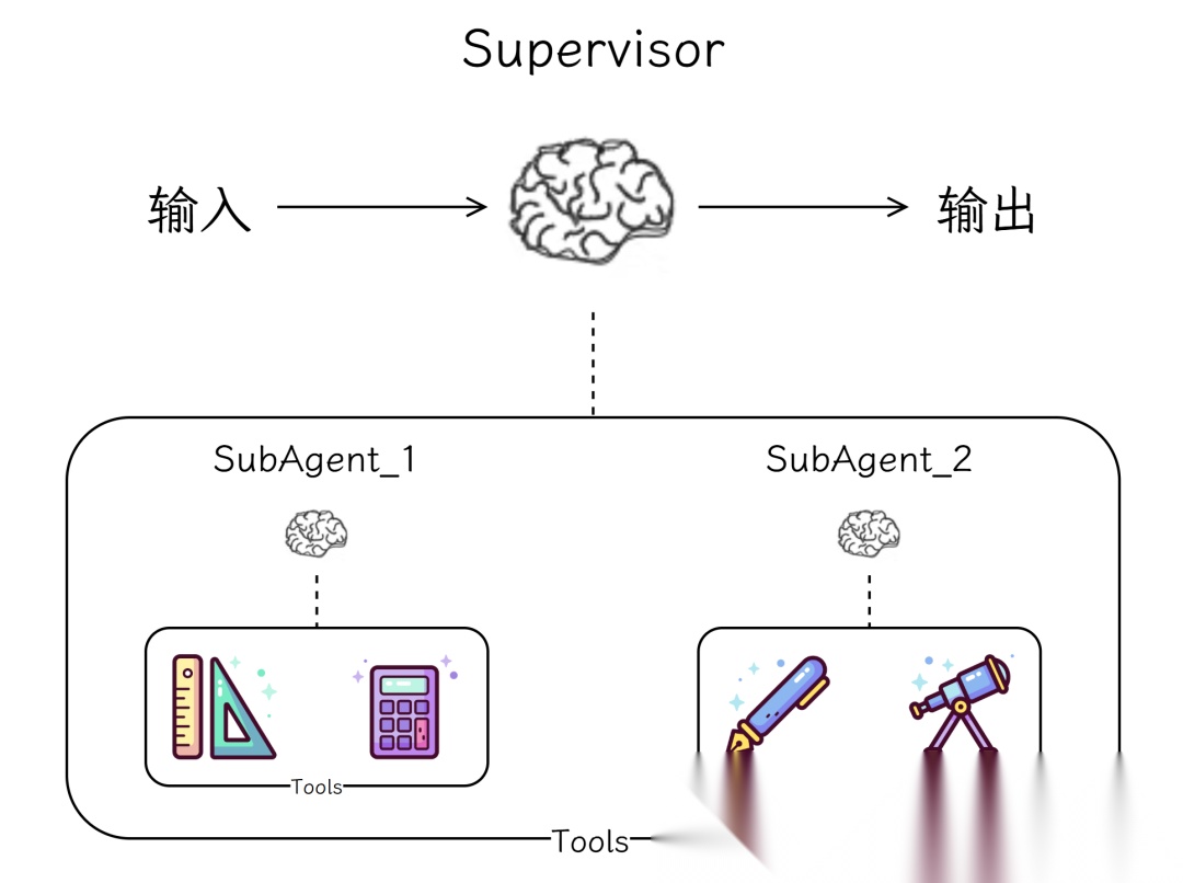 在LangChain 中可以将 Agent 封装为工具,将工具绑定到主管 Agent 来实现主管多代理模式。