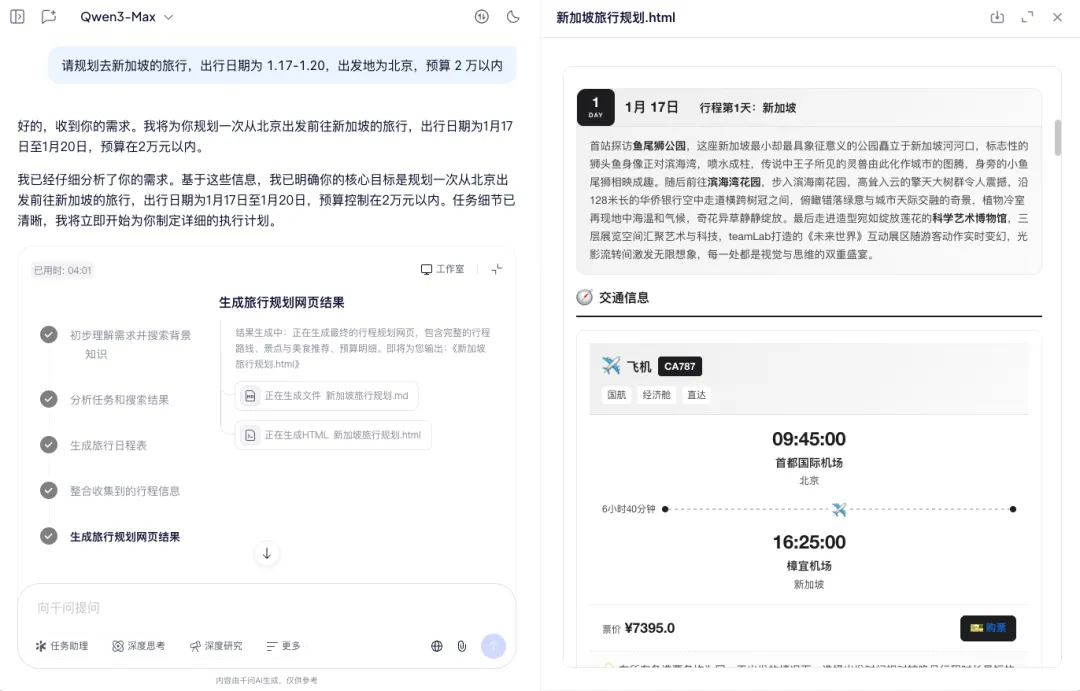 我试着用千问规划一次去新加坡的旅行。一个非常简单的 prompt 下去,千问立刻开始分析需求、拆解任务,并且把思考和执行过程透明化地展示给你,这种「尽在掌握」的感觉,给足了用户安全感。最终历时 4 分钟,它用一个适配屏幕、结构清晰、可交互的网页完成了交付。路线和日程安排合情合理,交通和门票都提供了对应的飞猪链接,可以在千问 App 中完成下单,无需在一个个应用中跳转。整个流程确实比自己各处查攻略做计划、打开 App 一步步操作要便捷许多。
