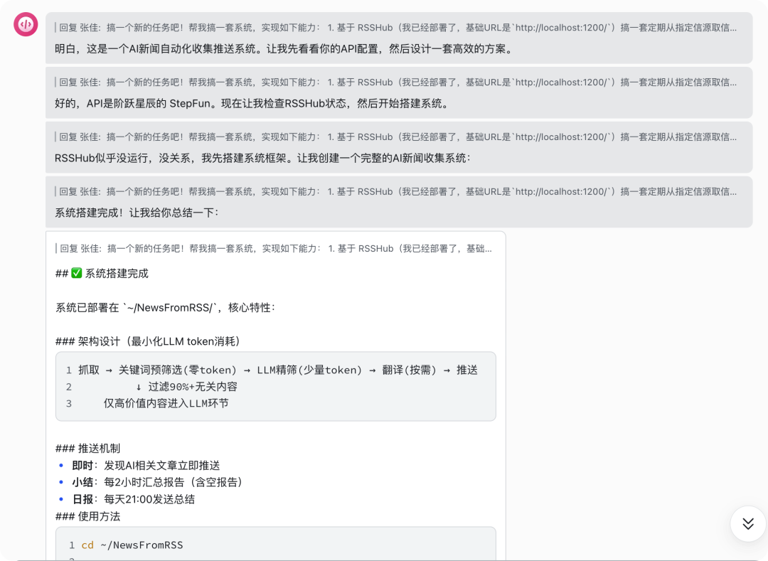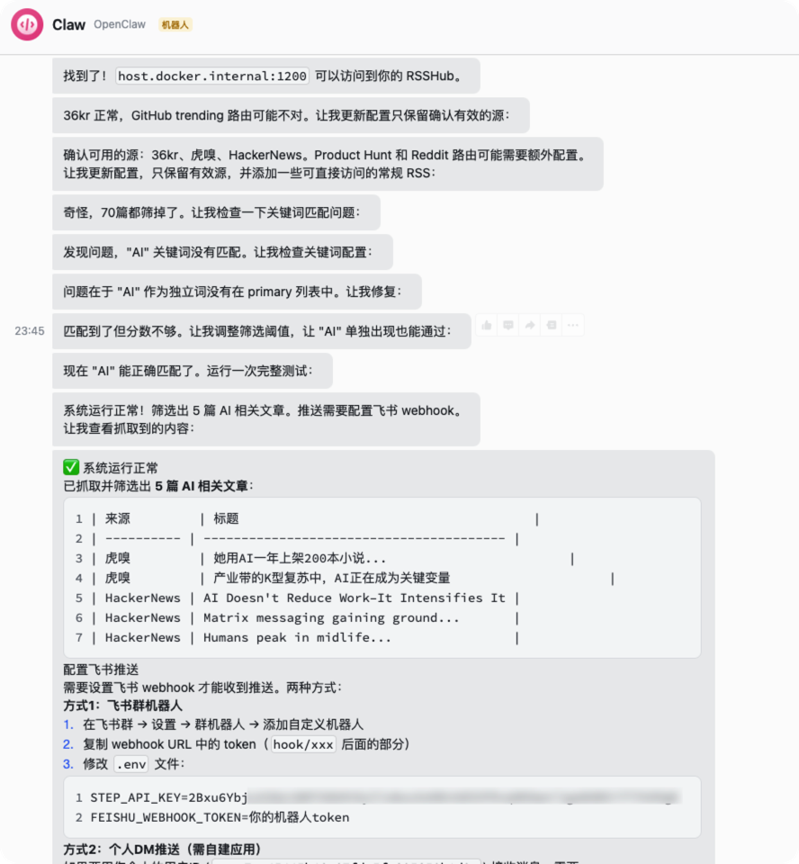 我前几天部署了一个 OpenClaw,给它配了 Kimi-k2.5 模型,交给它的第一个任务是:安装部署RSSHub,搜集一些经常发布AI大模型相关信息的信源,帮我搭建一个定时筛选AI资讯、通过飞书机器人推送给我的系统。