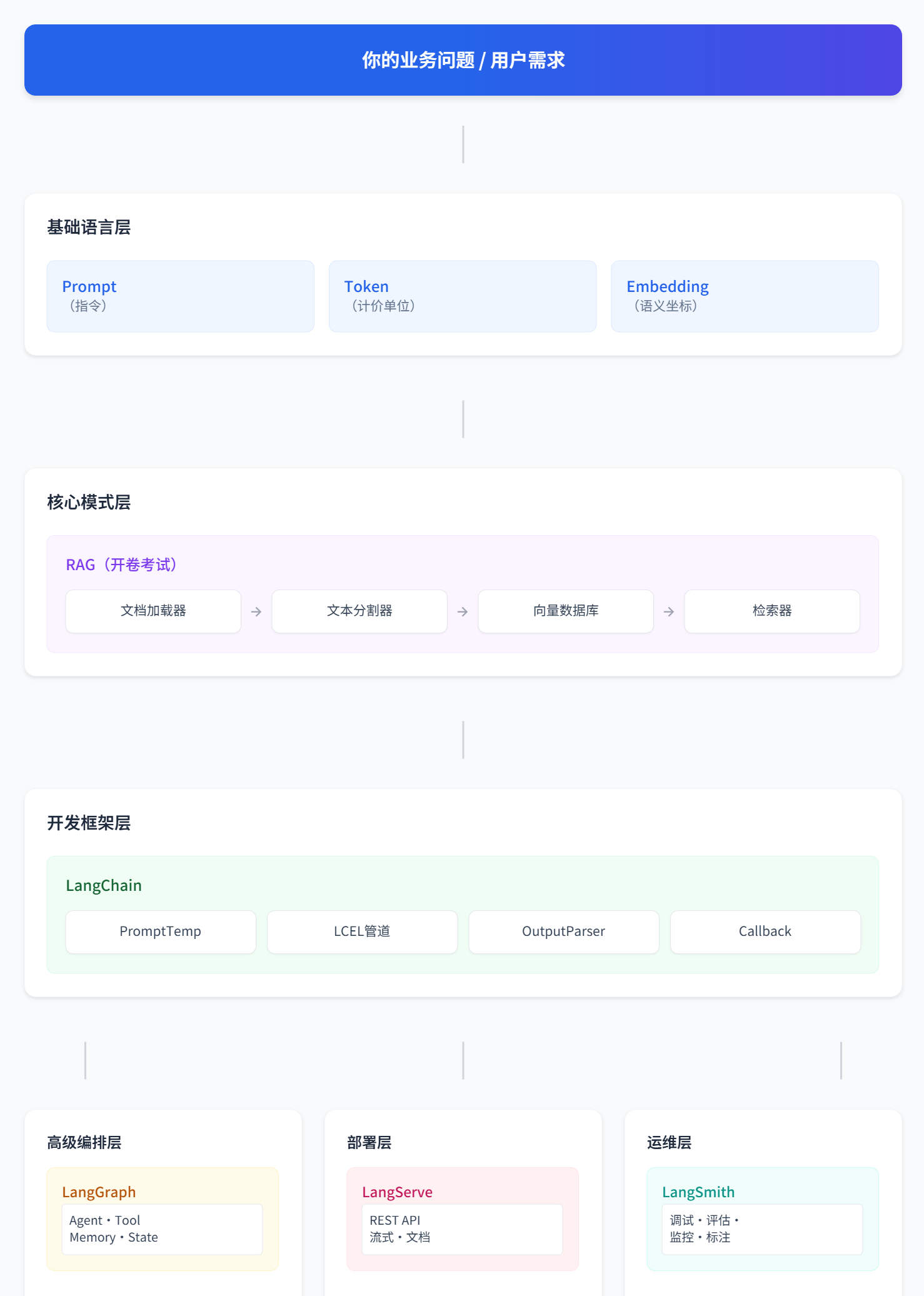 📌 在 LangChain 中:这是最主流、最成熟的应用模式,LangChain 提供了整套乐高积木。