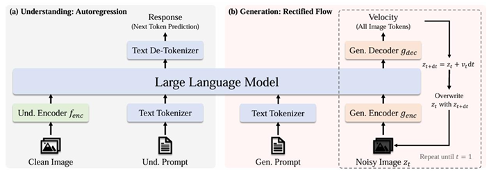 解耦设计的成熟**:**为了解决早期融合的弊端2025年的Janus提出了精巧的“解耦设计”。它虽然仍在一个统一的LLM框架内但为视觉的理解和生成任务提供了不同的编码路径。这种“分而治之”再“统一处理”的思路被证明是当前实现高性能统一建模的有效路径。