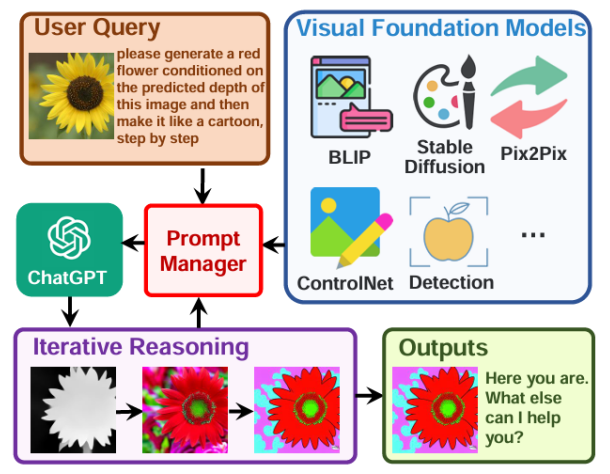 Visual ChatGPT的核心机制是围绕一个基于聊天的界面将用户的多模态指令(如“帮我把这张图里的猫P掉然后生成一张狗的图片”)分解为多个子任务。然后LLM会根据其对任务的理解生成调用不同视觉基础模型(Visual Foundation Models,VFMs)的代码或指令并整合它们的输出来完成用户的最终请求。