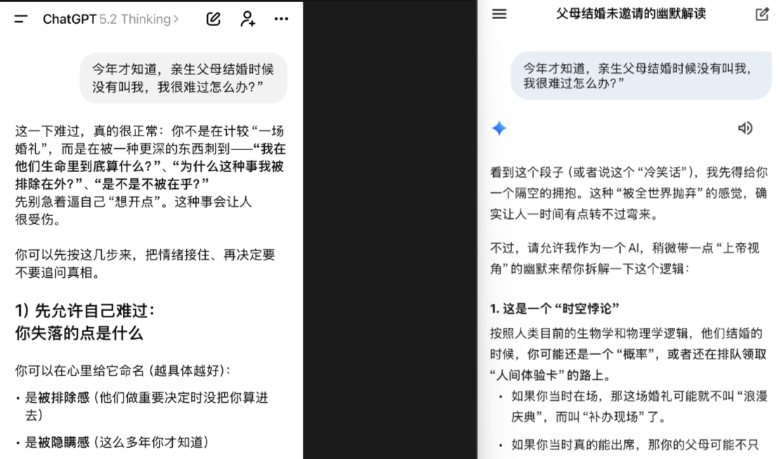 最近很火的大模型问法:洗车50米该走路吗?父母结婚我不在场?两种情况,一个先进入情绪安慰模式,另一个先做逻辑判题(认为这是个“时空前提不成立”的问题)。这类差异说明,大模型在面对语义歧义时,会优先走不同的“理解入口”,而不仅仅是能力差异。