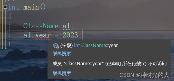 这里就涉及上述作用的第5条,默认是private,也就是说成员是不可访问的。如果我们想在作用域外直接访问它的话就需要加public。