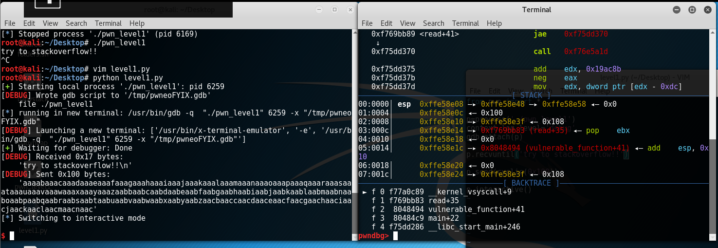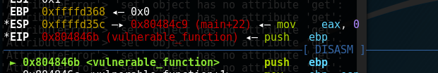 而且栈顶现在是0x80484c9,是call vulnerable_function下一条指令的地址