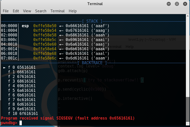 这个是正常的流程,假如我们用cyclic(0x100)来栈溢出呢?