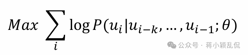 其中,P(ui∣ui−k,...,ui−1;θ)表示在给定前 k 个词 ui−k,...,ui−1 的条件下,模型预测下一个词是 ui的概率。𝜃表 示模型中的可变参数。