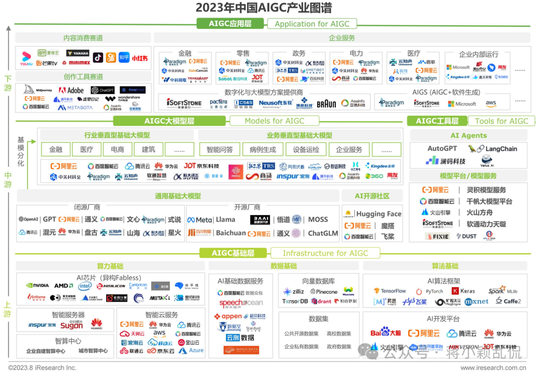 “2023年中国AIGC产业图谱”即下图,由艾瑞咨询整理,发布于2023年8月。