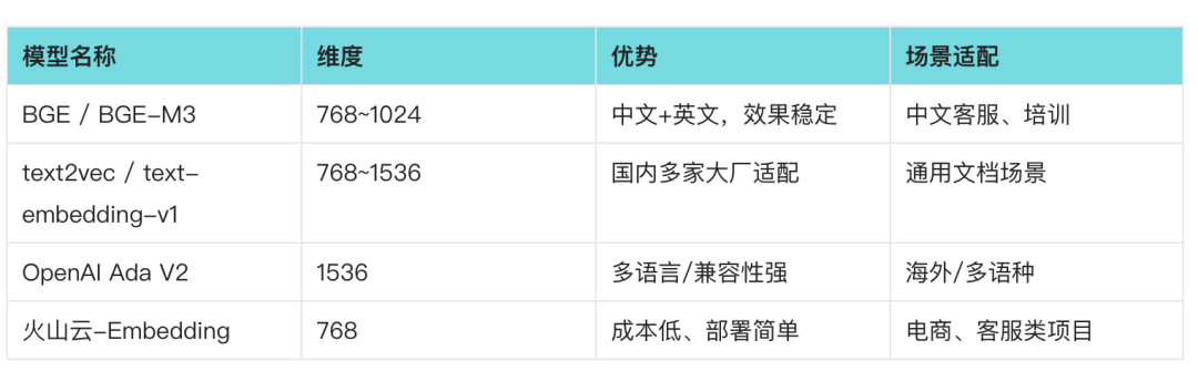 - 嵌入不要贪维度,维度高 → 向量库空间大 → 查询慢。
