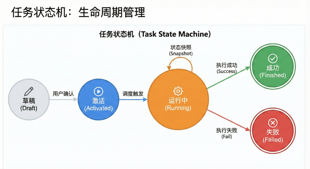- 生命周期管理:任务状态会在“草稿、激活、运行中、成功/失败”之间流转。这种模式借鉴了主流任务调度框架(如 XXL-Job)的设计,确保了状态的持久化。