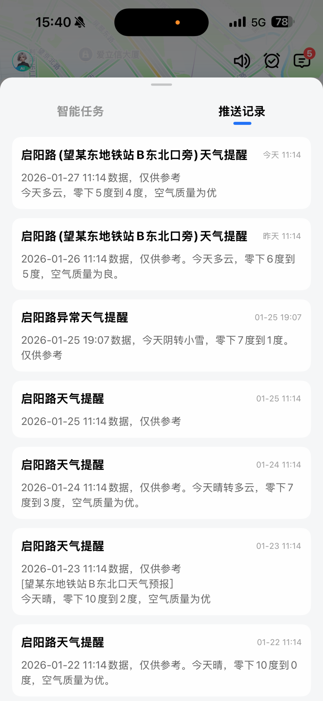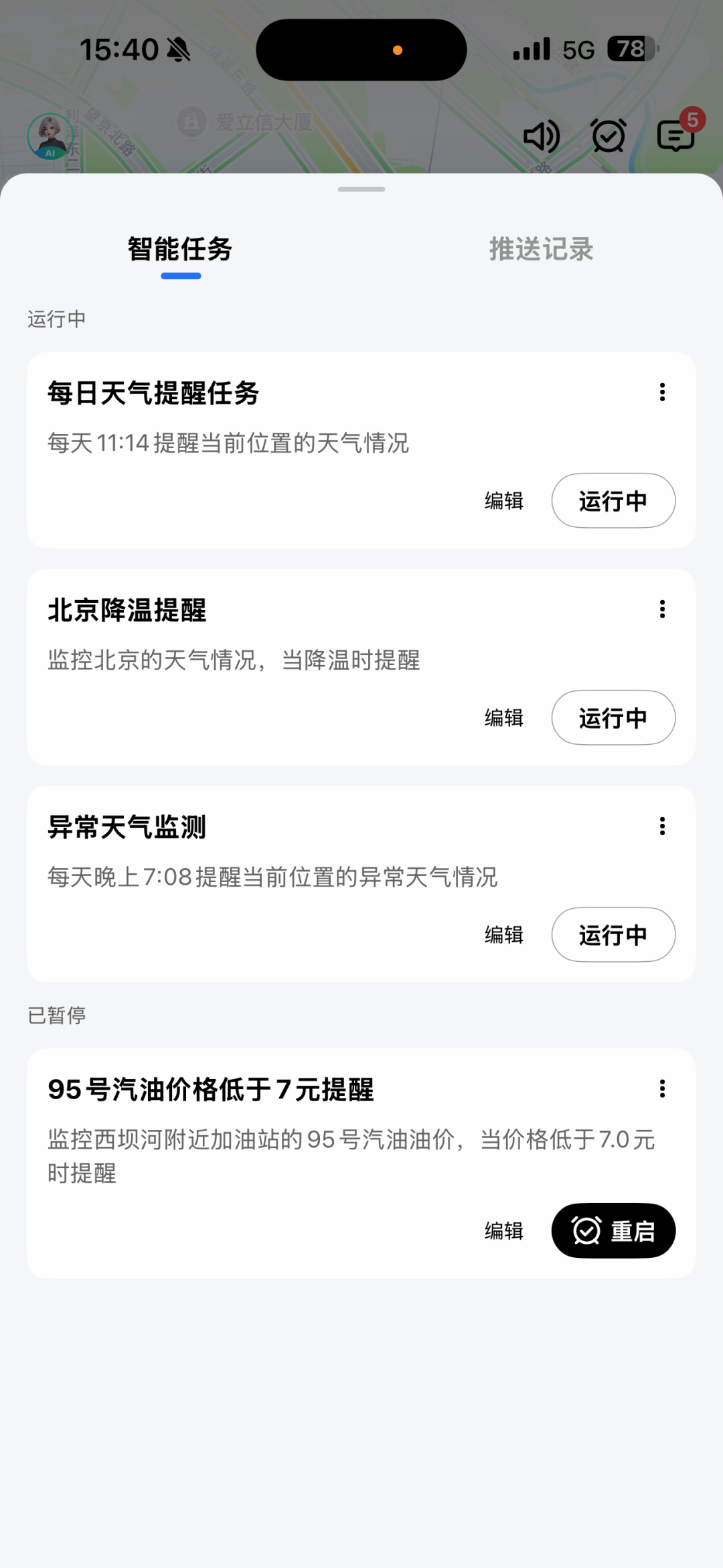 点击对话页顶部右侧小闹钟查看任务和任务推送情况: