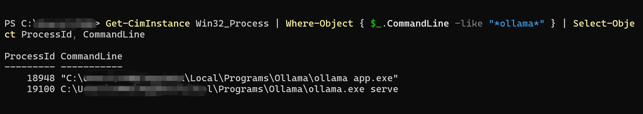 Get-CimInstance Win32_Process | Where-Object { $_.CommandLine -like "*ollama*" } | Select-Object ProcessId, CommandLine