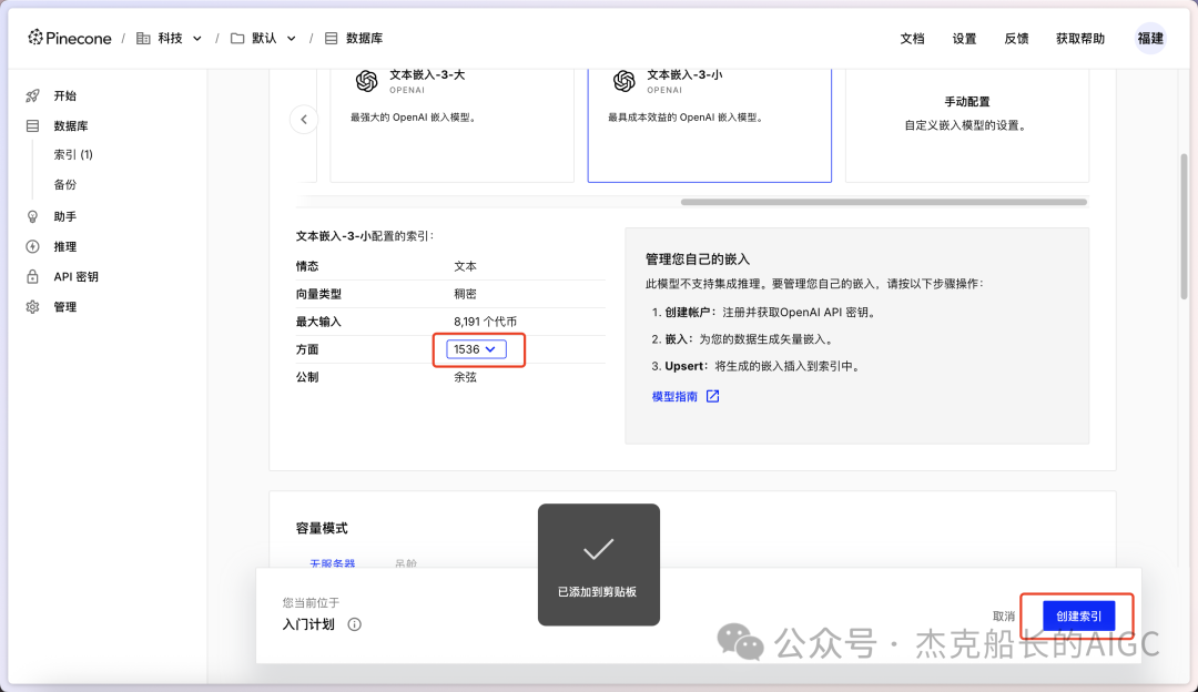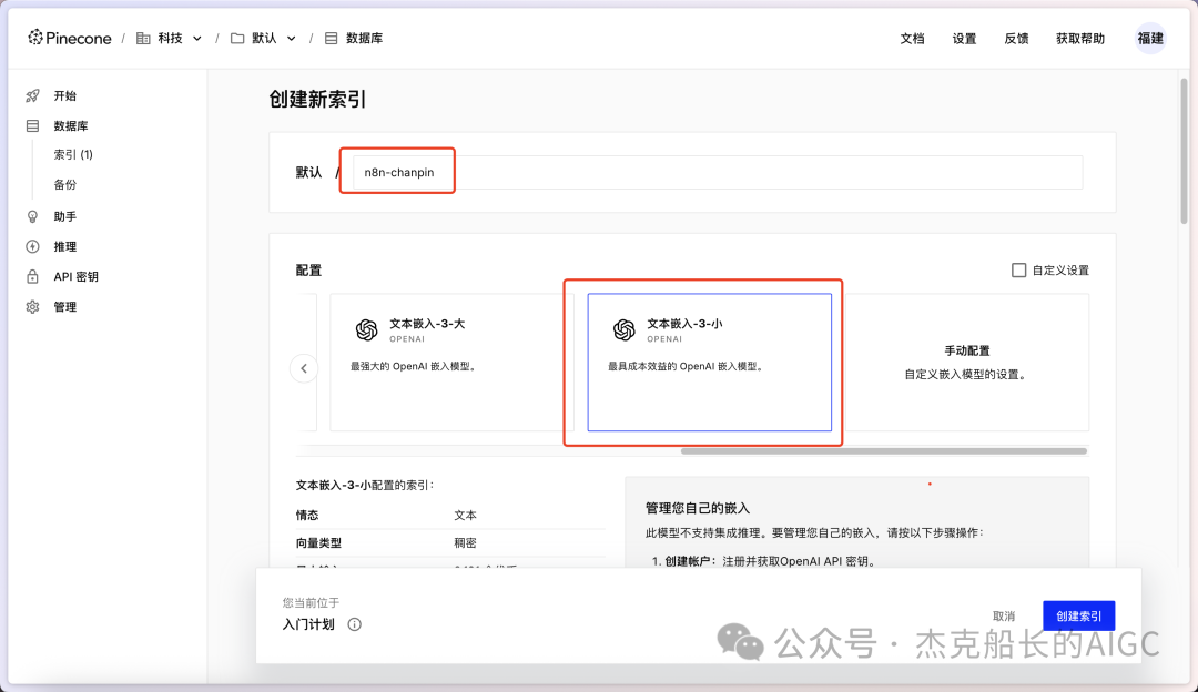 创建名称和选择open AI的模型作为向量模型