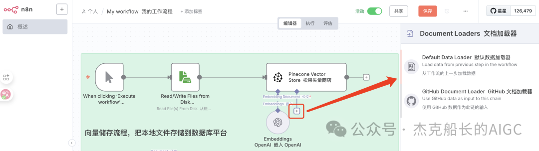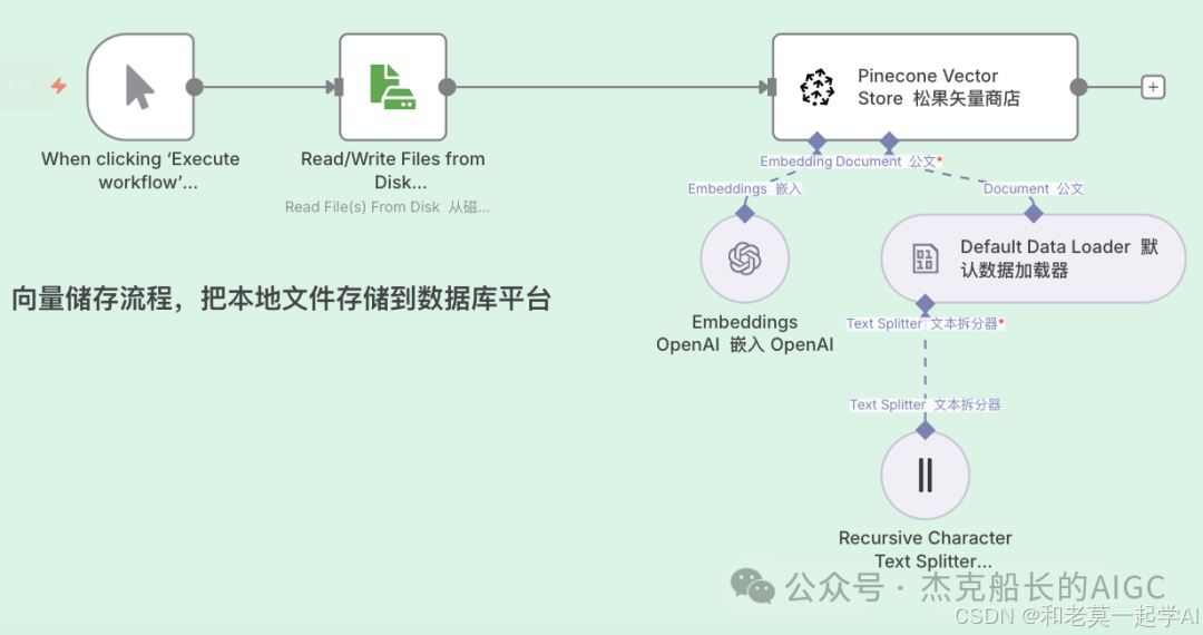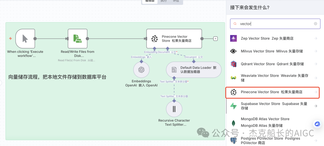 3.在次添加一个数据节点:Pinecone Vector Stor