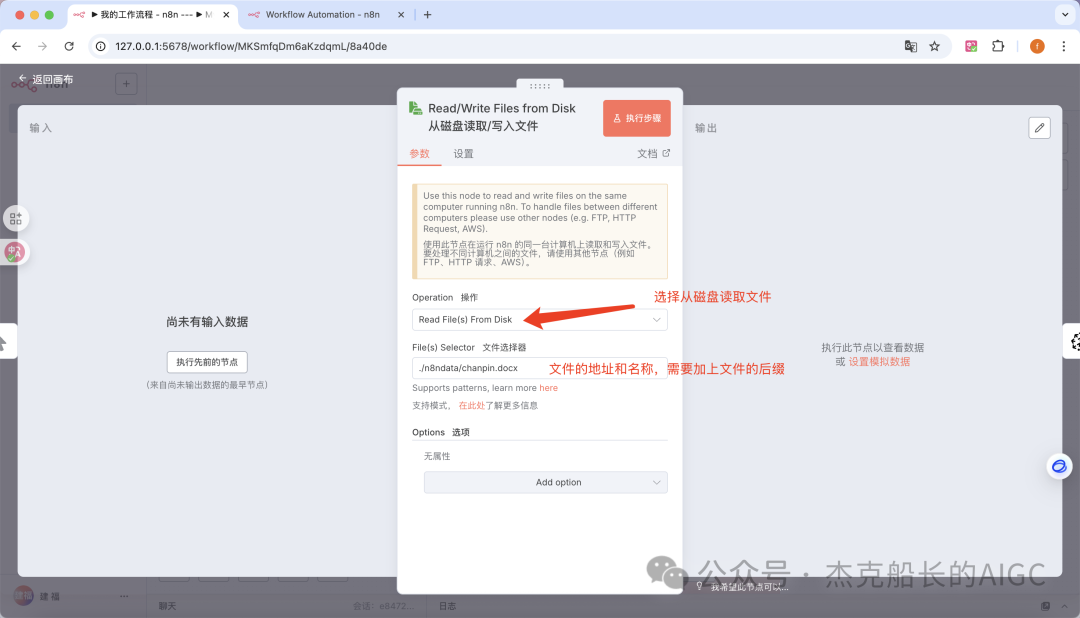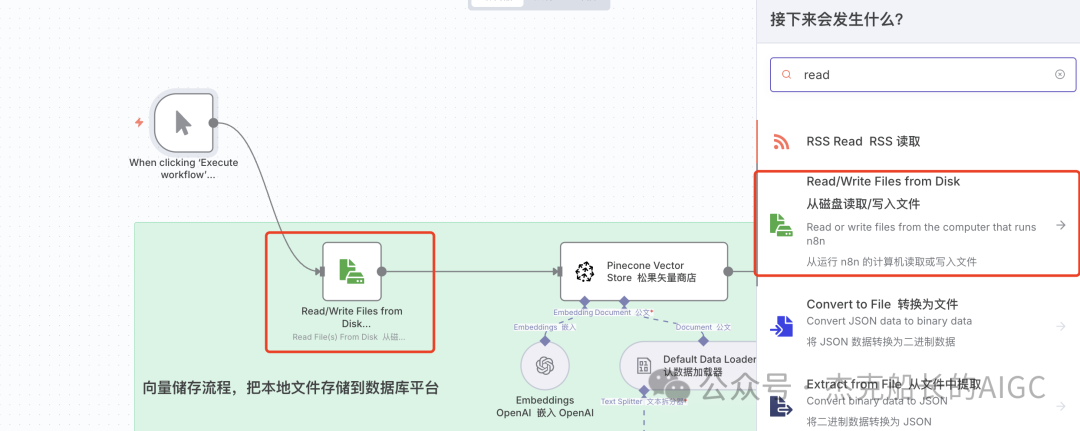 2.在点击执行工作流后面添加节点:Read/Write Files from Disk