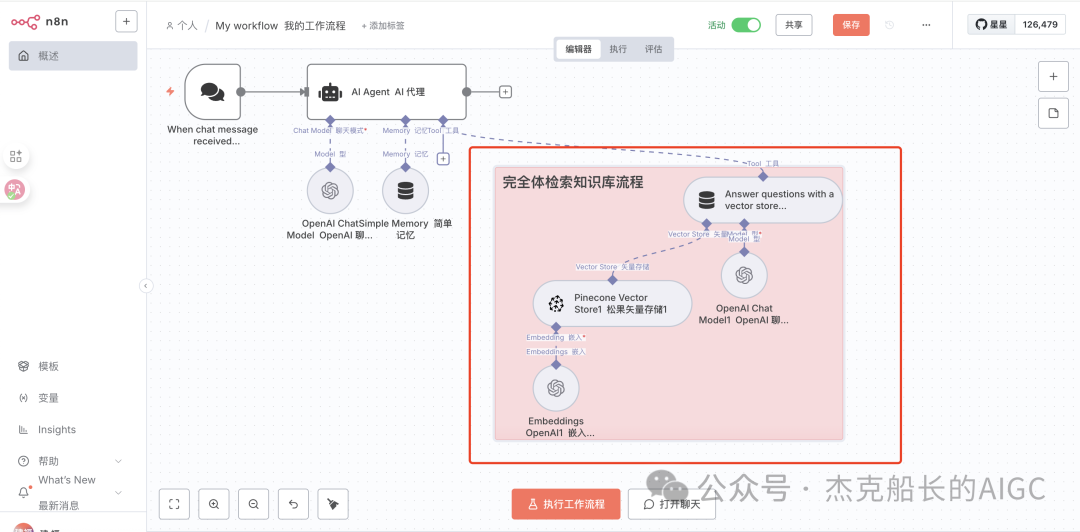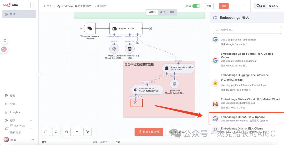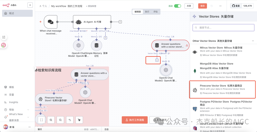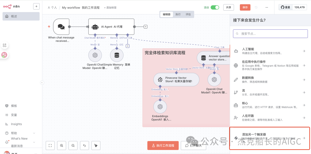 第二套流程是基于第一个流程中下面创建的新举措,不需要重新创建工作流,在添加中添加新的触发节点,也就是聊天时触发,这套流程中的AI Agent节点就不详细介绍,在舰长这篇文章中有详细介绍: