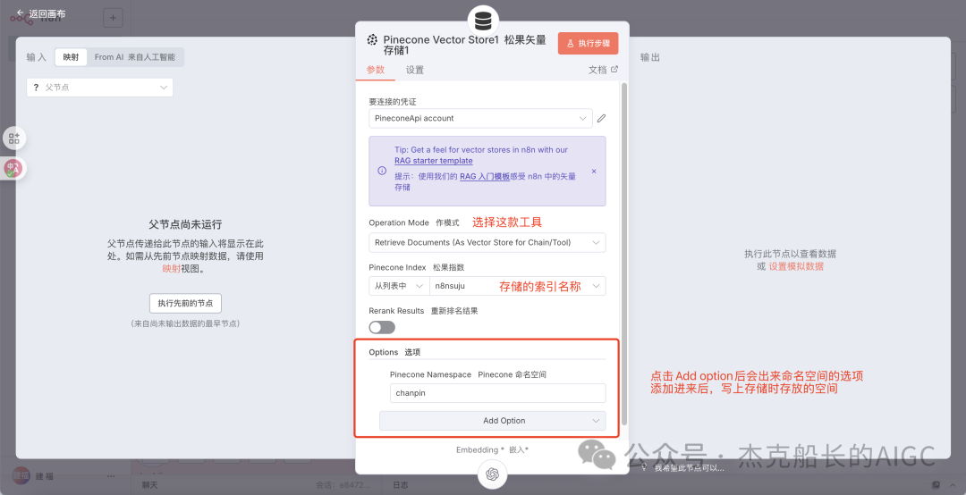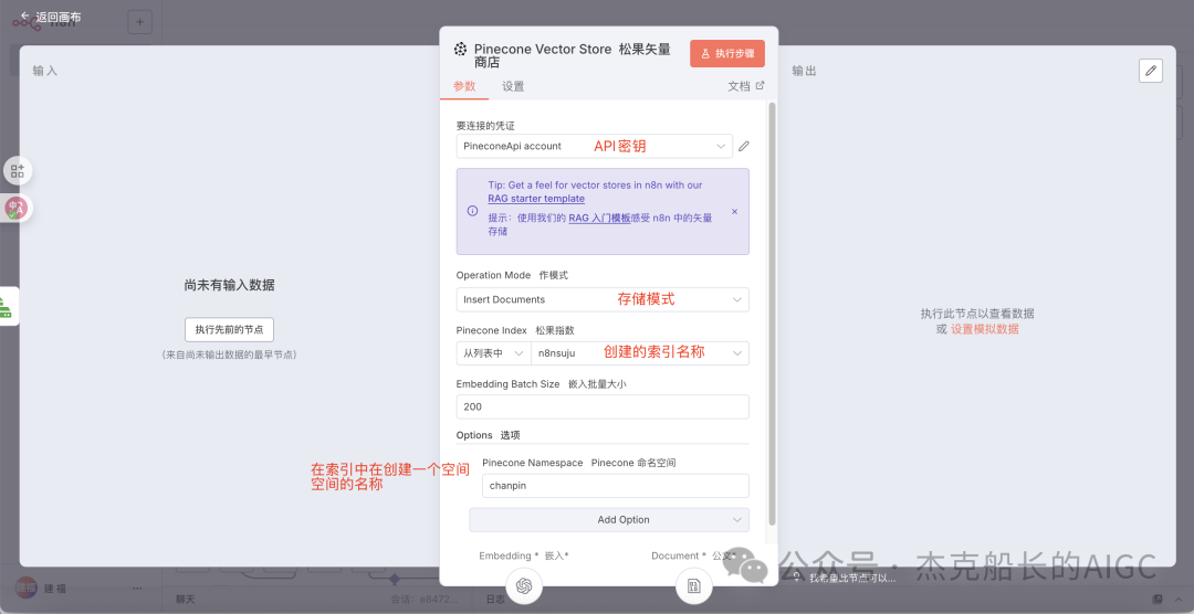 回到n8n中,点击Pinecone Vector Stor节点,按照图中以及上述流程的顺序填写配置即可