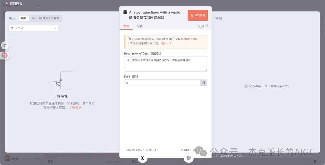 在存储文档也是使用该节点,现在是检索,同一个节点只需更改使用功能即可