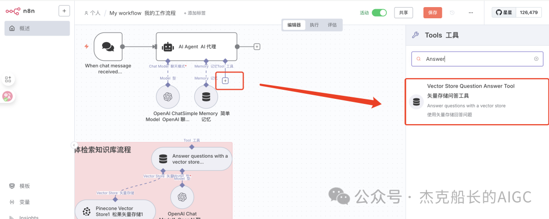 1.点击工具+号添加节点:Answer questions with a vector store