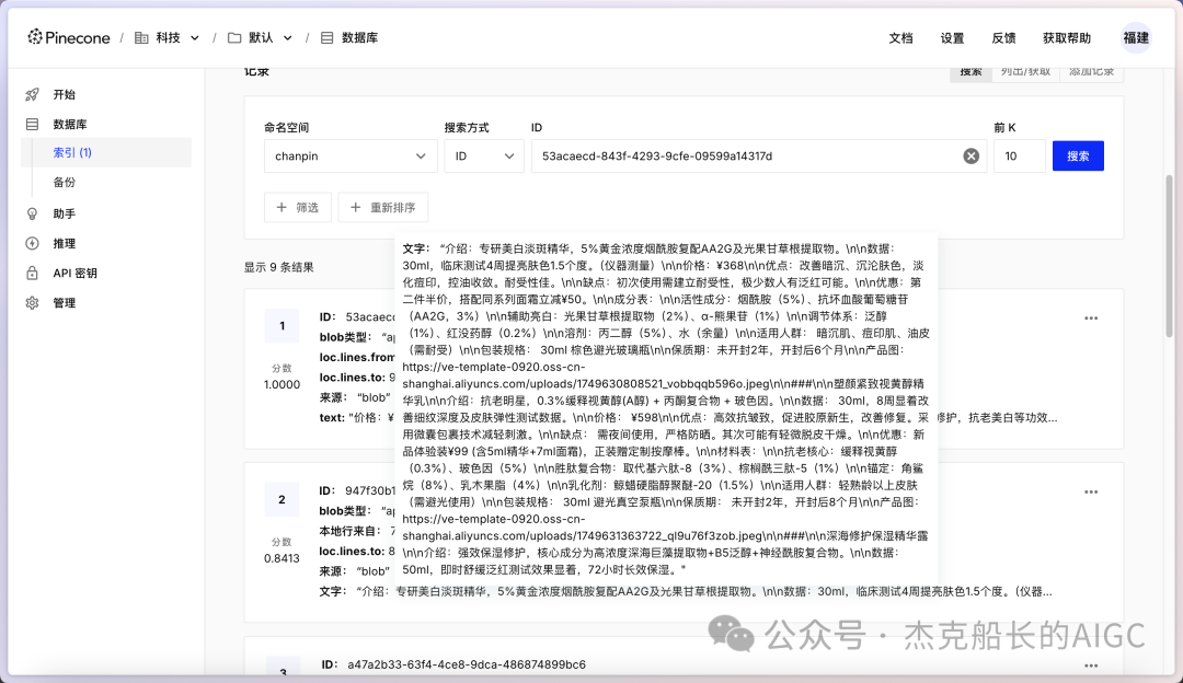 当执行流程时会通过本地磁盘设置好的文件名进行提取并传输给向量数据中进行分割存储使用,执行后可以在平台中查看: