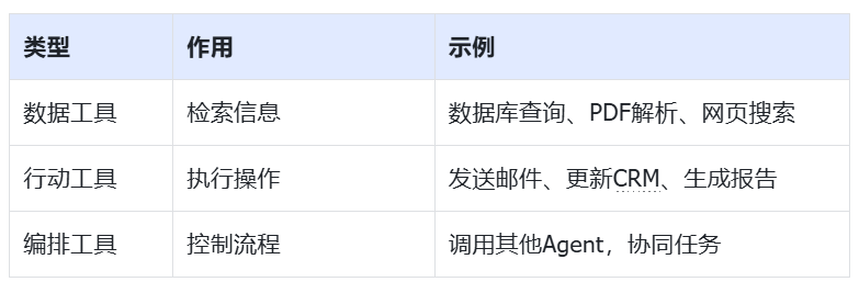 智能体真正的价值来自它能“动手”。工具可分三类: