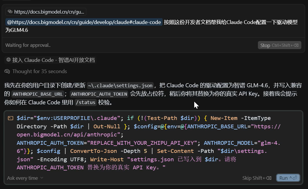 再把真实的GLM4.6的API Key给它操作替换掉即可~