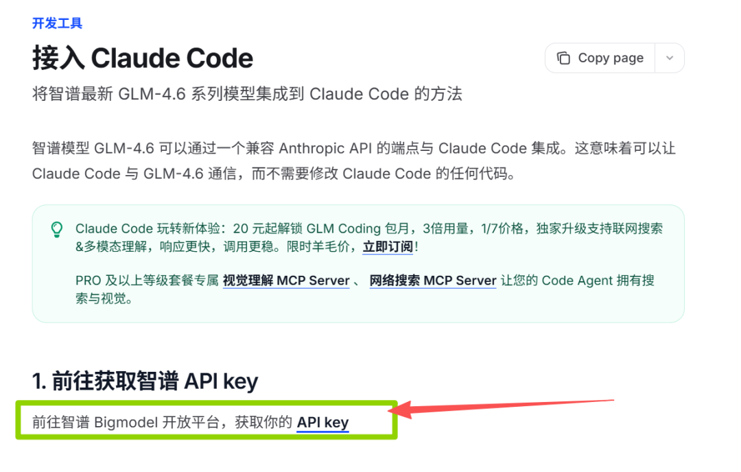 我们直接访问智谱的模型开放平台,找到Claude Code的部署开发文档,按步骤一步步来⬇️