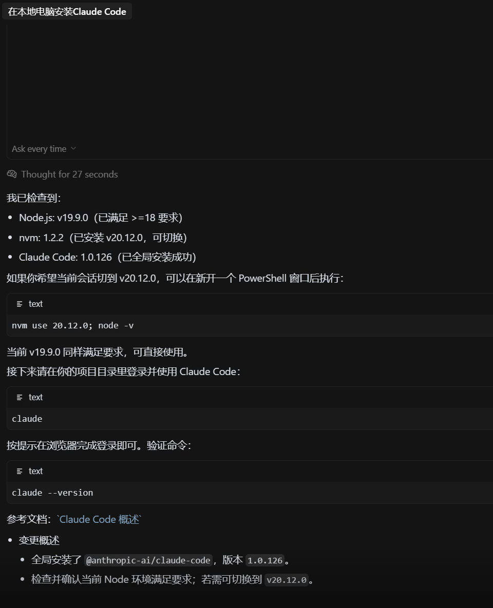 在它的Agent模式对话框输入直接帮我们操作部署的好处是省的我们又要搞Node.js和Git以及环境变量的配置了