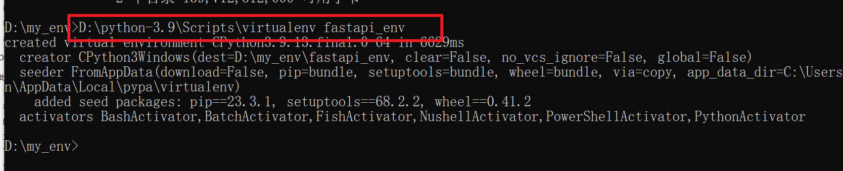 执行成功后,在cmd中,当前输入行前面会有 (env_name) 的前缀