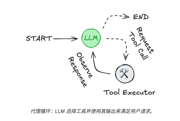 LLM 在一个循环中运行。在每次迭代中,它会选择一个要调用的工具,提供输入,接收结果(一个观察),并利用该观察来指导下一个动作。循环会一直持续,直到满足停止条件——通常是Agent已经收集到足够的信息来响应用户时。