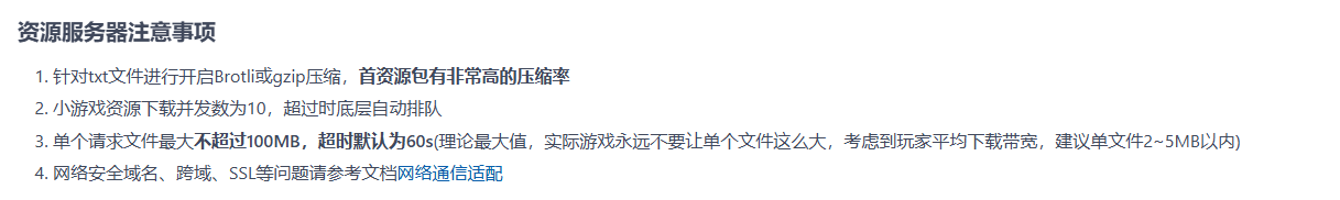 Q1:目前有个点比较陌生,就是小游戏的每秒资源后台最大同时下载数量,和下载文件大小的指标比较缺失, 这块会影响玩家跑图的过程中场景加载比较慢的问题。 请问有没有官方大数据指标?