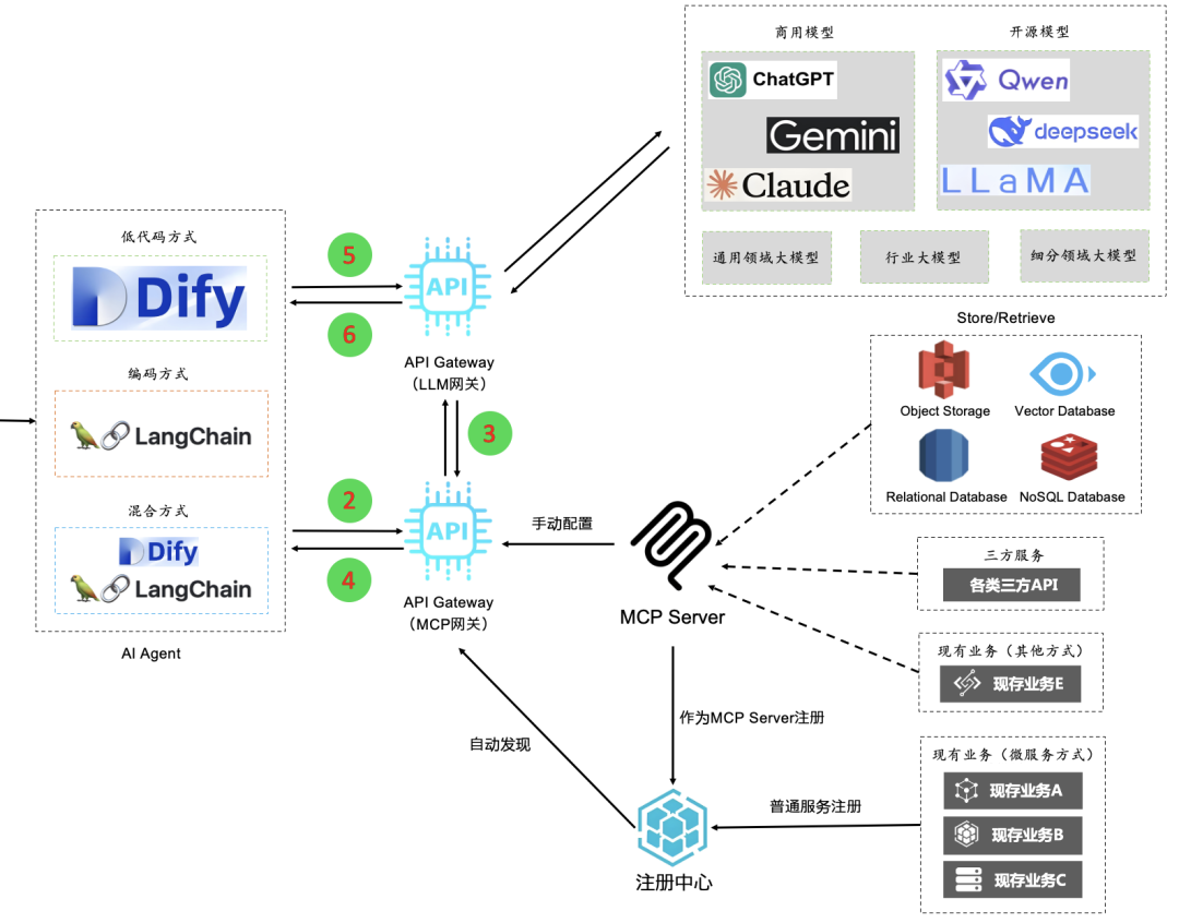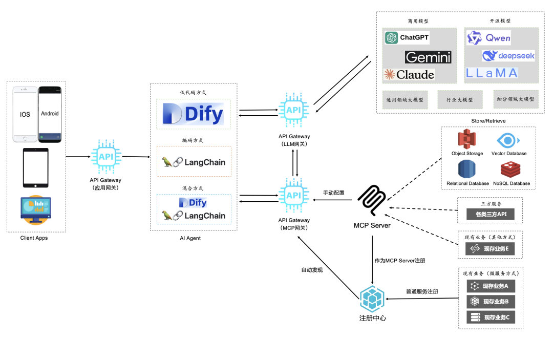 最后总结,无论哪种架构(区别在于是否用MCP方式访问),都覆盖企业常用场景。AI应用获取数据时,可直接连数据源,或接入企业内部各系统(如图中现有业务微服务等方式)及第三方服务。