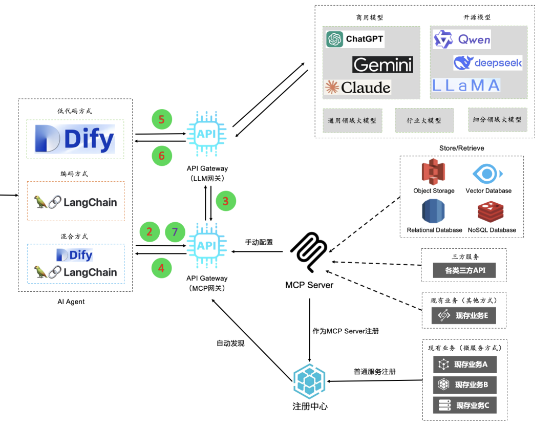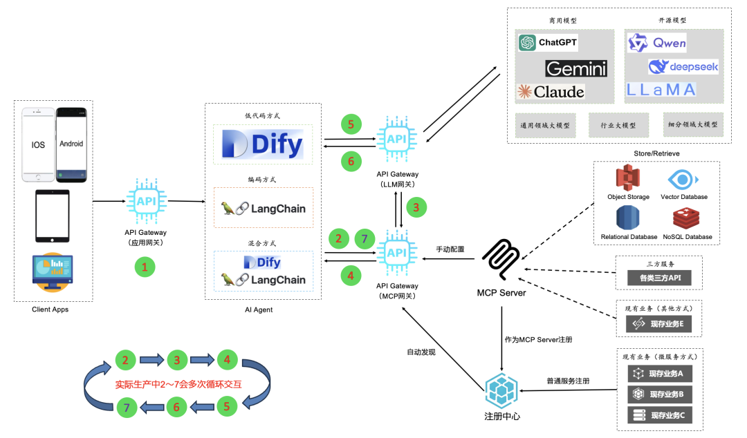 后续还有流程未讲,如第7步多次循环调用获取各业务数据后,最后再经LLM网关调用大模型,大模型统一处理信息后返回给终端。