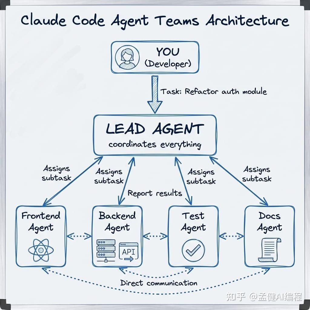 Claude Code多智能体团队架构的核心优势,不仅在于清晰的角色分工,更在于其“并行协作、双向反馈、闭环落地”的协作模式——它打破了传统开发的串行流程,实现了“前后端并行开发、测试与开发同步推进、文档与代码同步更新”,大幅缩短了项目周期,同时保障了项目质量。我们以“重构用户认证模块”这一具体任务为例,拆解其完整协作流程: