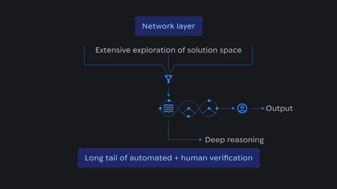 AI推理流程示意图:展示了网络层如何对解题空间进行广泛探索,然后收敛为结构化的推理,并最终通过自动化验证与人工审核进行确认
