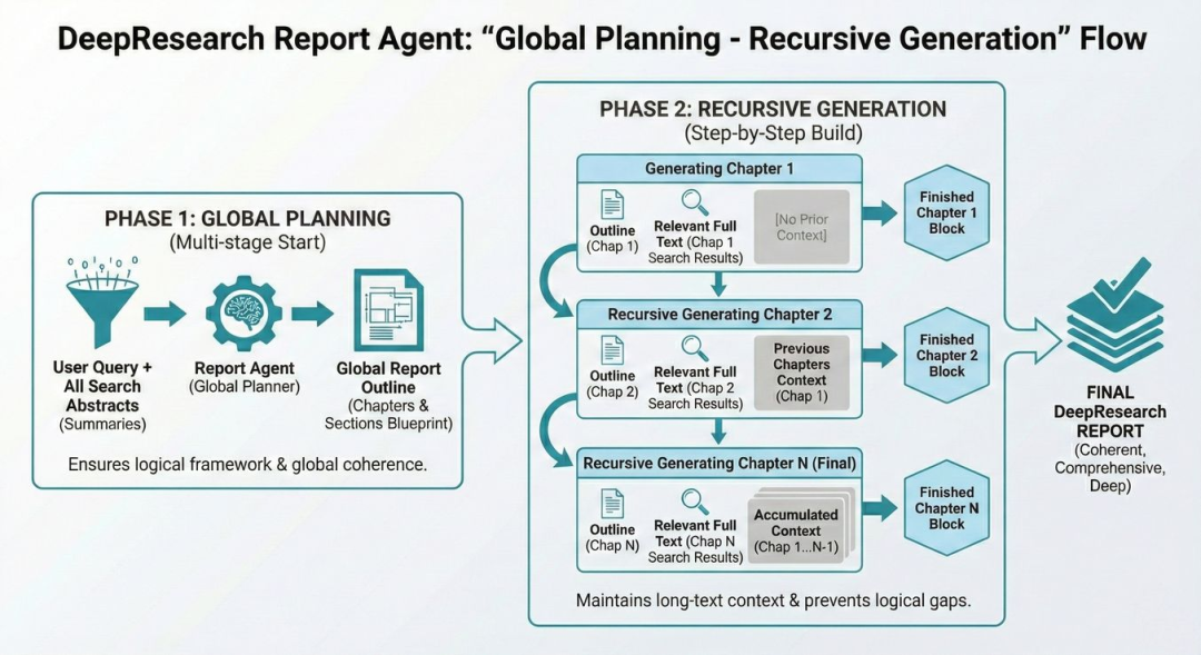 其次,LongCat 学会了人类写报告的方式。通过多步骤渐进式生成架构,AI 会先基于全网搜索摘要生成全局 「报告大纲」,确保逻辑框架的严密性,随后通过「递归生成」 (Recursive Generation) 的策略,把当前章节大纲、相关搜索文档与前序章节上下文联合输入,逐章撰写。