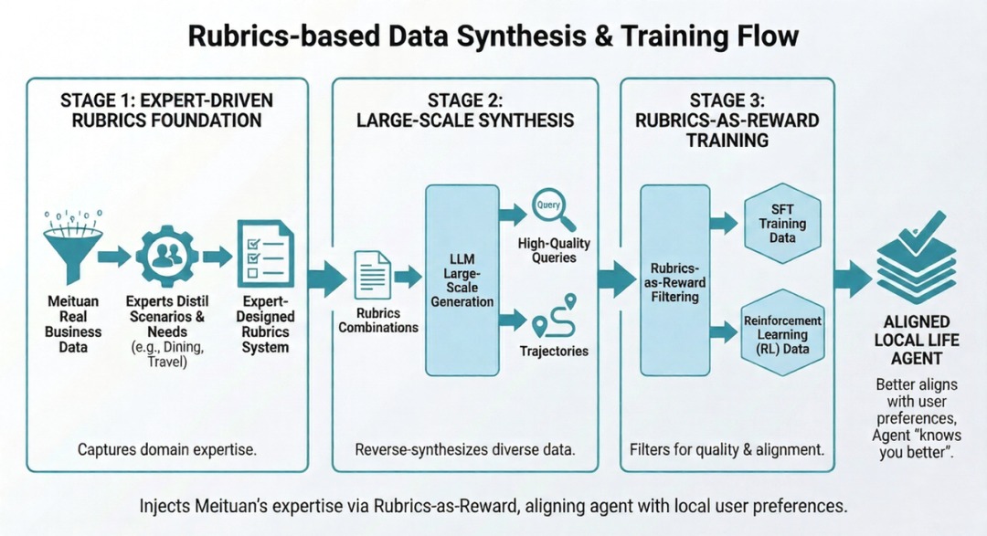 再往下,LongCat 通过多种校验机制,进一步保证了生成内容的准确性。在数据清洗与强化学习阶段,LongCat 引入了 Rubrics-as-Reward 机制,建立了包含引用准确率、信息召回率、报告深度、指令遵循度及可读性在内的多维评分体系,对训练数据进行高标准的清洗与筛选。