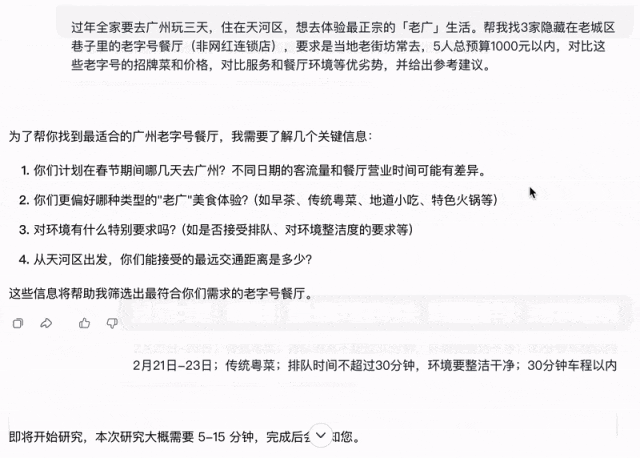 LongCat 并没有贸然作答,它先抛出几个关键问题:具体哪几天去广州?更偏好哪种类型的老广美食?对环境有什么特殊要求?能接受多远的交通距离?