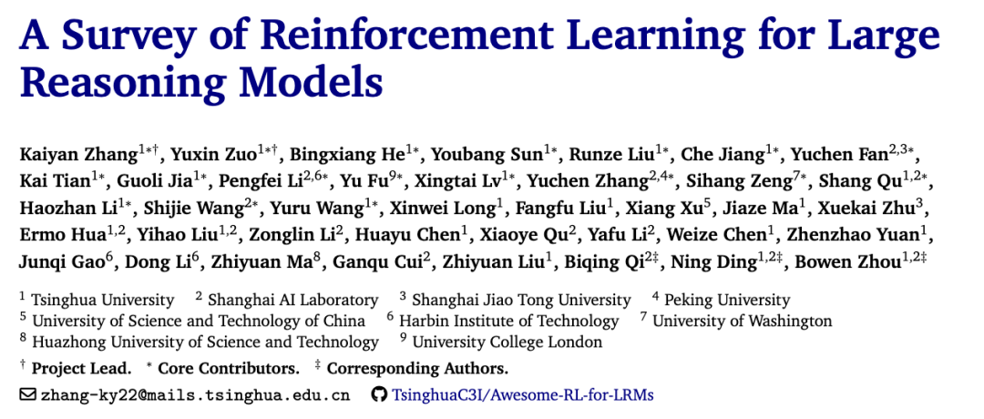 过去两个月里,来自清华大学和上海人工智能实验室等的研究者们组织并总结了推理模型的最新 RL 研究,形成了一份非常全面的调查综述,回顾最新进展,讨论面临的问题,并展望未来的发展方向。