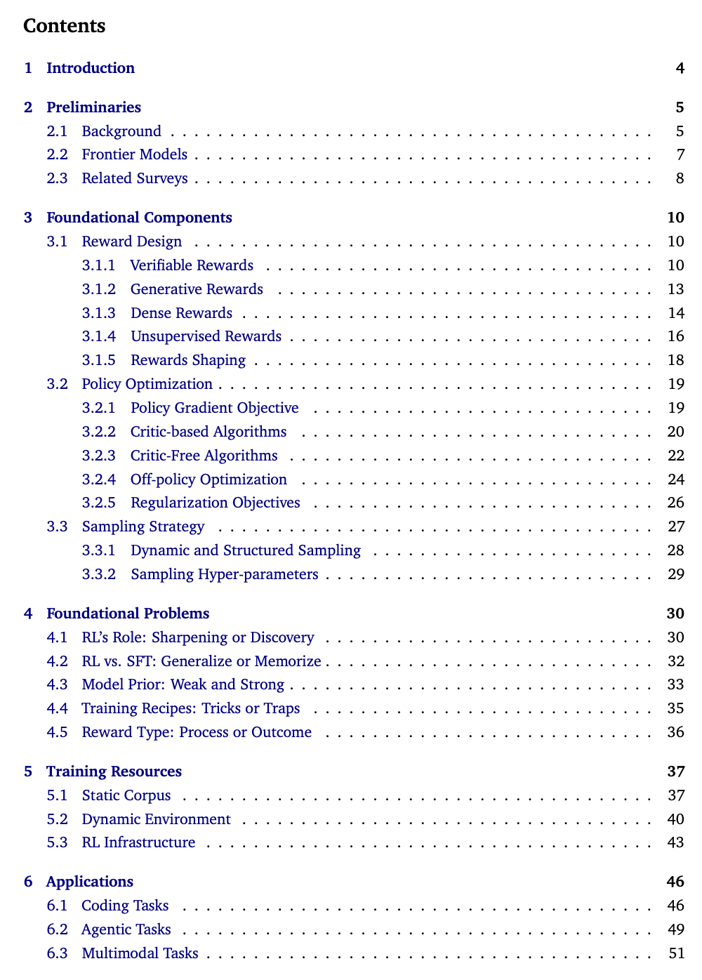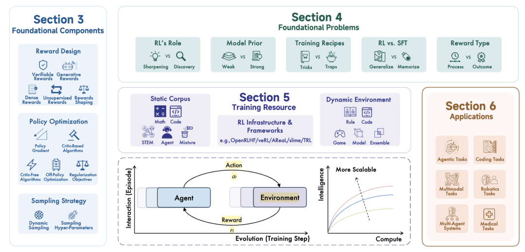 综述 RL 在广泛任务中的应用,涵盖编程任务、智能体任务、多模态任务、多智能体系统、机器人任务以及医学应用。