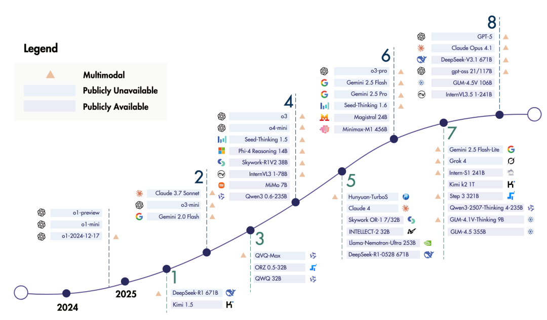 大模型发展时间线。展示了采用强化学习训练的具有代表性的推理模型的发展历程,其中包括开源和闭源的语言模型、多模态模型以及智能体模型。
