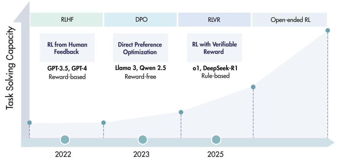 语言模型中 RL 方法的演变,展示了从 RLHF (2022) 到 DPO (2023) 再到 RLVR (2025) 以及未来开放式 RL 系统的进展。每个阶段都展示了任务解决能力和能力提升的增加。