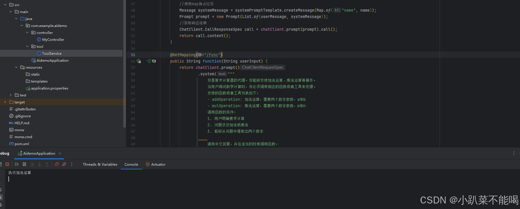 - Spring AI 的函数调用 (Function Calling) 功能允许大语言模型在生成回答时触发预定义的外部函数,从而实现动态数据获取或业务逻辑操作(如查询数据库、调用 API 等)