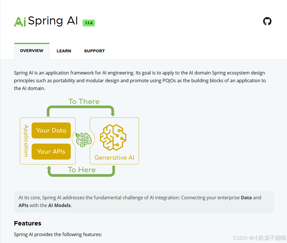 官网:Spring AI 是一个人工智能工程应用框架。其目标是将Spring生态系统的设计原则(如可移植性和模块化设计)应用于人工智能领域,并推动使用POJO作为人工智能应用的构建单元。目前的稳定版本是1.1.2和1.0.3,支持jdk17+ 和spring boot 3.x,当前演示版本使用的是1.1.2版本。
