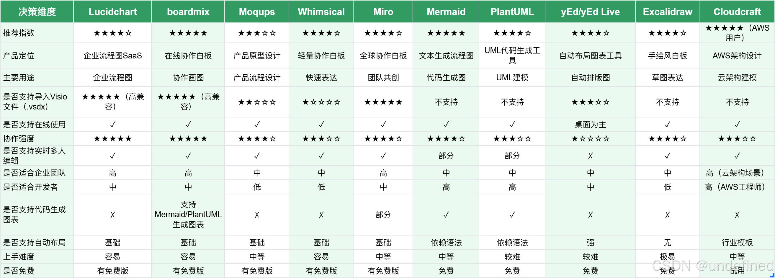 把前边介绍的 10 款主流的 Visio 在线网页版工具的核心指标放在一起比较,你能更直观地看出每款绘图工具的差异: