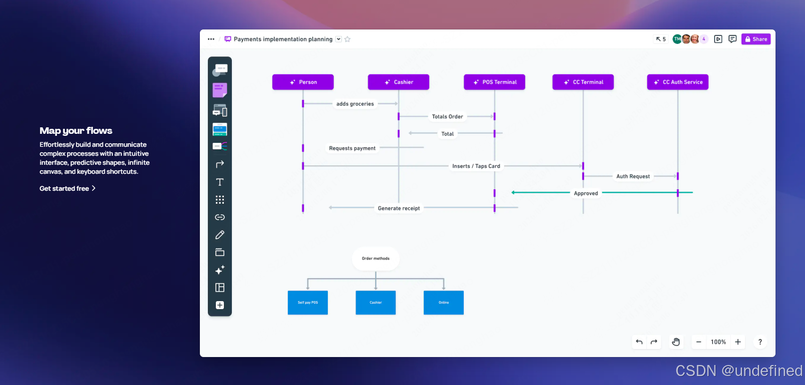 自动美化图表:你管内容,Whimsical 管排版。形状间距、连线走向都会自动调整到最美观的状态。不用花时间对齐元素,图表自然就很整洁。