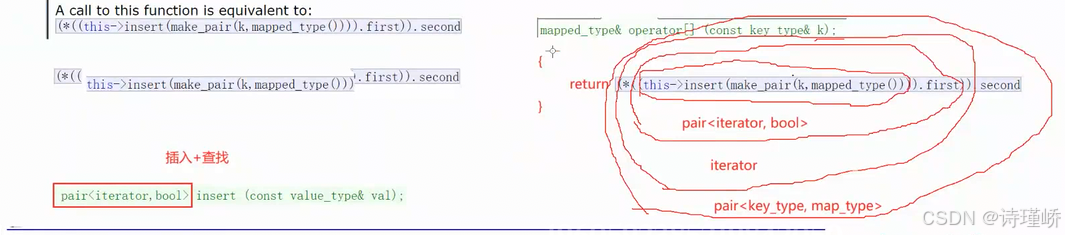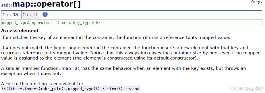 // 1、如果k不在map中,insert会插⼊k和mapped_type默认值,同时[]返回结点中存储